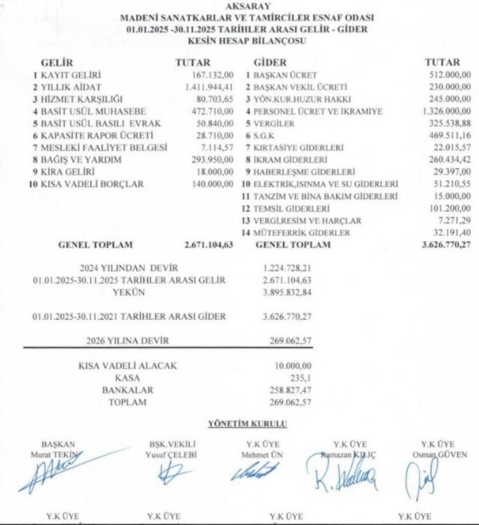 Aksaray Madeni Sanatkârlar ve Tamirciler Esnaf Odası için hazırlanan 01.01.2025 – 30.11.2025 dönemine ait “gelir–gider kesin hesap bilançosu” kamuoyuyla paylaşıldı. Paylaşımda “şeffaf odacılık” vurgusu yapılırken, bilanço kalemlerinin tek tek görülebildiği belirtildi.