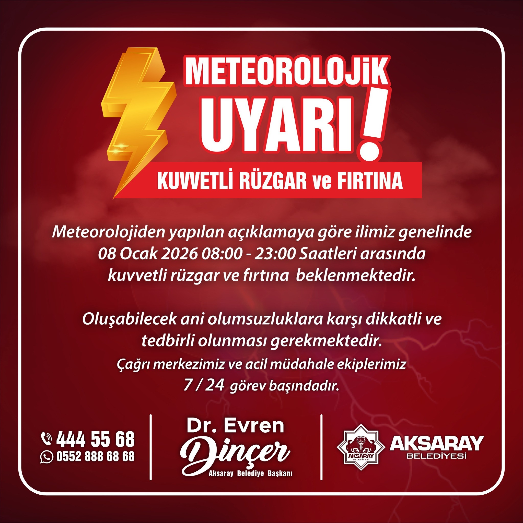 Aksaray Belediyesin’den Meteorolojik Uyarı geldi. Kuvvetli Rüzgar ve Fırtına karşı vatandaşlarını uyardı.