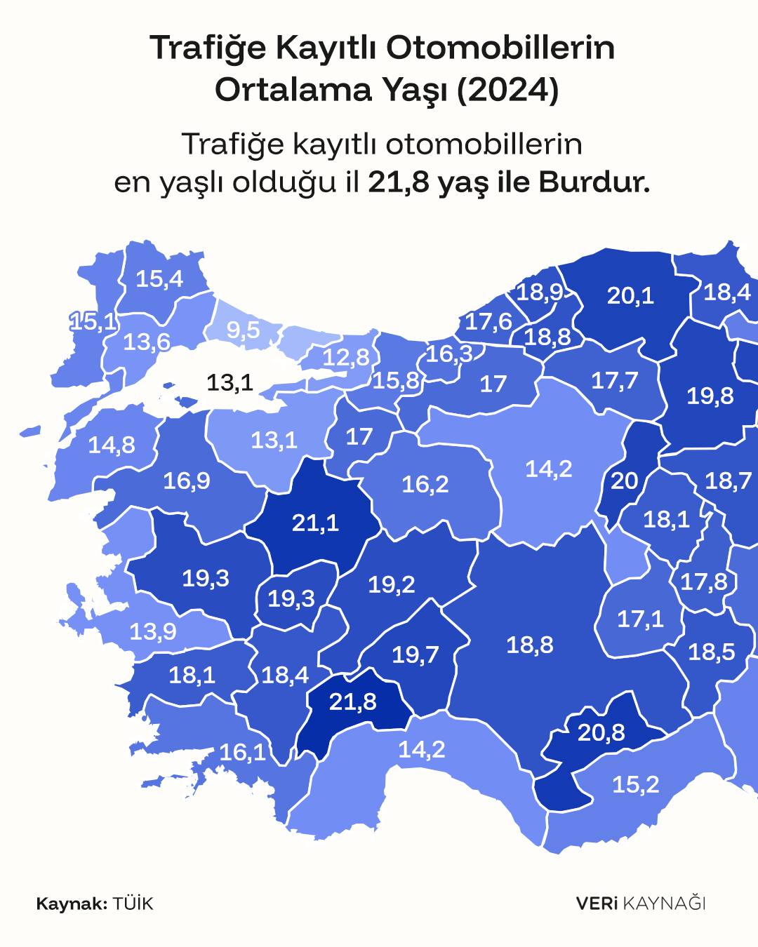 Türkiye genelinde trafiğe kayıtlı otomobillerin en yaşlı olduğu il Burdur (21,8 yaş) olurken, otomobil parkının en genç olduğu il ise Şırnak (6,2 yaş) olarak açıklandı.